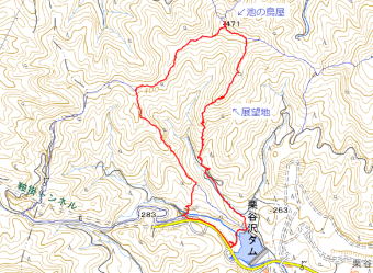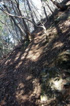 2023年01月09日のお山めぐりは栗谷沢ダム北西岸の駐車場から地形図無名峰「池の鳥屋」です。 10時35分に駐車場を出発、ダム湖北岸を東進、渡れなくなった橋脚を見て左の踏み跡に入ります。斜面に付いた踏み跡から舗装林道に出て左へ、道が右に逆Uの字に曲がる地点でショートカットで上の舗装路に出て左上へ進み、すぐに右側の植林地支尾根の踏み跡を急登です。 |
