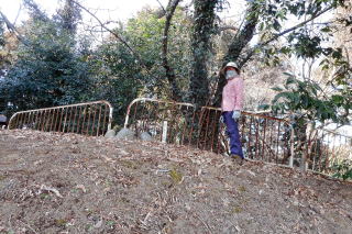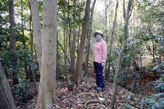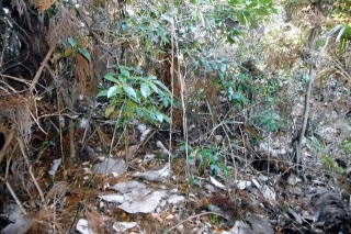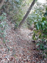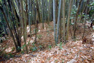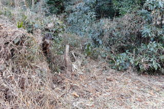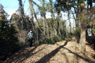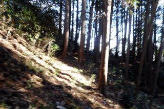 | 2023年01月22日のお山めぐりは鹿沼市の岩下山・御殿山・拳骨山です。 まずは御殿山公園駐車場に車を止めて、反対側の岩下山ですが、取り付こうと思った道は行き止まり、北上して十字路を右折、すぐ右のコンビニ奥の斜面は登れそうになく、さらに東進して薮の薄そうな所から人目を忍んで(笑)突入します。すぐに急斜面で右上に登って鞍部に出て左上に直登しますが、結構な切岸でした。 取り付きはここから 鞍部は腰曲輪か 左上へ直登 ![]() 登り切ってみると東西の幅の狭い尾根で左に下ったV字の尾根はすぐに登り返します。右は緩い下りの末広がりの斜面で農作業か青いビニールが見えます。S&Pは南に曲がる細尾根を進んで行くと右に平地が広がっています。ここがこのお城の主郭でしょう。 右下はVゾーンだろう 最高地点から南進 ![]() 最高地点はどこでしょう。とにかく南に進みますが、先は下って腰曲輪が見えて城郭部分はここまでのようです。城郭の西端を北上し最高地点と思しき場所で記念のデータをデジカメに収めます。 南は腰曲輪で城域は終了 最高点にて ![]() 帰路は往路を戻り、取り付き地点から西進し下りますが、民家に入るようになりますので、いったん最初の鞍部まで下り、西進してみました。コンビニ背後の尾根下のコンクリート壁はやっぱり降りられないので、三度鞍部まで戻り当初の取り付きに飛び出しました。 さて、次は拳骨山です。コンビニ前の十字路を西に下り、次の十字路手前で右の駐車場を横断、拳骨山の南西尾根末端に取り付きます。くるぶしほどの笹、すぐに石仏2体が現れます。左下からの道型に乗った先には鳥居と洞があります。洞の前にはいわゆる狛狐1対、石祠前には小さな狛狐が1対並んでいました。 拳骨山(坂田山) 駐車場先の尾根末端へ ![]() さて、お山は石祠左から奥に細くなった踏み跡を登って行きます。山頂近くになって細道は右へトラバース、南東尾根に出て左上に登って行きますが、ここは堀切となっている尾根に東側に下り、反対側に登り返した細道が直接山頂に行く参道でした。 狛狐2対の稲荷神社 道は右へトラバース ![]() S&Pは左上に尾根をたどり、登り切って右下の堀切を越えて急斜面を直登すると小広い山頂の北端にはお社と石祠数基が待っていました。展望なしの山頂はそさくさと撤収、南東の細道を下ると道は直角に右下へ、堀底から登り返して往路の踏み跡に復帰しました。 右下の堀底へ 拳骨山の山頂にて ![]() おあとは往路を下るだけです。お狐様のいる神社の脇を通過、幅が広くなった道型は尾根を離れて右に下るとすぐに消失しました。ほんの10m位の斜面を下り民家前の舗装路に飛び出しました。さて、最後は御殿山ですが、地形図を見れば県の合同庁舎付近から左上に実線路が登っており、三角点近くに登れそうです。 取り付きの駐車場先の十字路を東進、GPSでカンニング、合同庁舎の手前で左上に舗装路を登ります。道は右上に曲がり、ほどなく舗装から土道になり、野球のグラウンドに出ました。左に進んで三角点に寄ってから、最高地点に向けて北上です。忠霊碑の後側辺りが最高点のようでデジカメに画像を収めて撤収です。 三角点にて 御殿山最高点にて ![]() 忠霊碑の狛犬さん1対をデジカメに収めて、左へ下ると舗装路に出ます。さらに左へ、右には冒頭画像の岩下山が浮かんでいます。駐車場には11時18分の到着でした。 所要時間は1時間22分、地形図無名峰(中世城郭)3座の小さなピークハントでした。 |