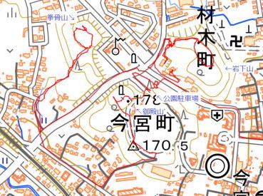 ![]() 御殿山から岩下山 山というより市街地の丘?3つのお山は中世城郭跡です。 |