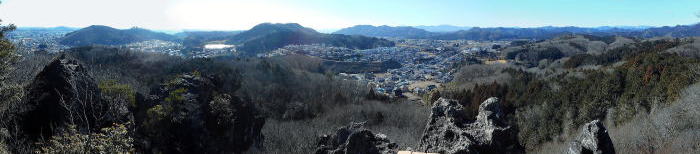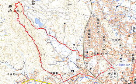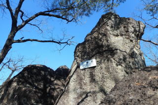 | 2023年01月29日のお山めぐりは2007年3月以来の鹿沼の岩山です。 駐車場は前2回と違い、御殿山公園から9時52分に出発です。左に〇日に登った御殿山、右に岩下山、正面に見える拳骨山(坂田山)に向かって出発です。左折して舗装路を下り、最初の十字路を右折して登り口手前の10時09分、日吉神社で天保の狛ちゃんに御挨拶、その先から右上に登山道を登ります。 |