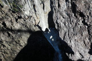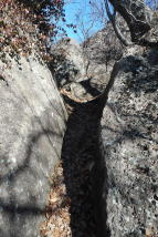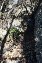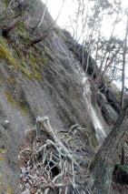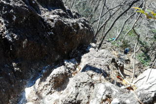| 植林地内の緩い登りから岩が出てくるとロープの下がる岩場の登りになります。左上のC峰の岩頭からは小藪山・富士山から粟野方面のお山のパノラマ、手前にはA峰・B峰が目に入りました。 小藪山・富士山 大平山 粟野方面の山 ![]() 登山道は赤の矢印の誘い、土道、岩と岩の間をすり抜け、岩溝を登り、10時43分雑木に「三番岩275m」の名板を見ます。滑落注意の板を見て、再び岩の間を抜け、ハシゴ場、三度の岩の間、ハシゴ場と続きます。 岩溝を 岩と岩の間を 三番岩の名板 ![]() 次の小広い小ピークの片隅でランチ休憩です。滑落注意の板をデジカメに収めてリスタート、少し下って「ニのタルミ」のエスケープルートの分岐を通過、正面に二番岩と思しきピークを見ます。登り切って右上に見た岩頭に「二番岩」のプレート、デジカメに収めてそさくさと北に向かいます。 中央に直角のハシゴ 二番岩 ![]() 二番岩を過ぎると三度目の危険地域の板、この先猿岩の鎖場の注意板ですが、ここから一番岩まで三番岩から二番岩までのようなところはありません。登山道は一番岩のピークを右から巻いているので、案内板に従って左上に登ります。2組6名がランチ中の一番岩山頂には12時31分の到着でした。 先行4名を追う 山頂より二股山から日光連山 ![]() お帰りは猿岩手前から左の記憶が飛んでいる巻き道を選択、落ち葉の乗った急降下に肝を冷やし、傾斜が緩んだ鞍部で左に石切り場に下がるロープと右下へのテープを比較、右を選択します。少し進んで登りになり「西鹿沼⇒」の文字を見て、登り返しを選択、正面に猿岩の鎖場が目に入りました。 西鹿沼⇒ 猿岩の鎖場 ここで右下へ ![]() 登山道は左に方向を変えて鎖場の下を通過していました。岩山の北尾根末端に出て、右へ緩いアップダウンの下りが続き、「一のタルミ」からの登山道を合流しますが、左のゴルフ場脇の舗装路へは進入禁止でした。再び緩いアップダウンの下りで、視界が開けると右に民家、道はそこから舗装路になります。 ルートは丁字路は直進ですが、今日は地形図の神社マークの探索で左へ向かいます。神社マーク近くの男性から情報収集の結果、神社ではなく薬師堂とのことで、探索終了、駐車場所へは13時57分の到着でした。 駐車場(0:17)登山口(0:30)三番岩(0:46)二番(0:39)一番岩(0:58)民家脇(0:25)駐車場 所要時間は4時間05分(歩行3時間35分)展望・スリル満点の岩山でした。 GPS軌跡図(カシミール3D使用) ![]() |