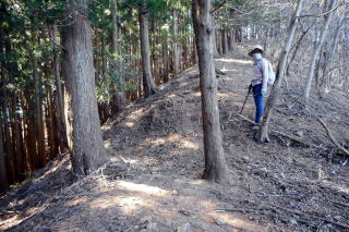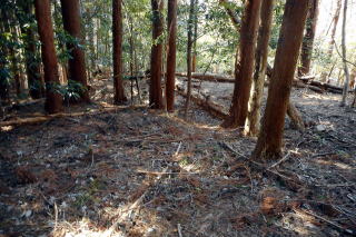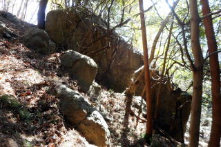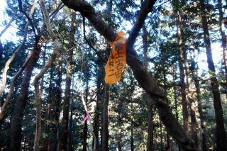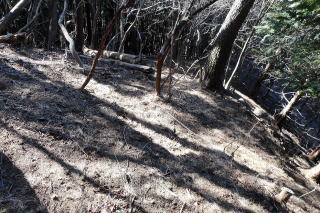 | 次の谷山砦跡という中世城郭のピーク、山頂直下で段差が見えましたが堀切と呼べるものではなさそうです。登り切ったピークは平らな山頂ですが中央近くに盛り上がった所に石祠が一基、南側には2段の曲輪が見えます。進行方向のピーク端にある三角点を見て撤収です。 雷神山の山頂の石祠 ネット上に出てない堀切 ![]() 少々下って緩いアップダウンの尾根、鹿に葉っぱを食われた笹が林立し、何かを引きずった跡に鹿の足跡があります。まもなく引きづった跡はなんとバイクのタイヤと判明しました。三本木山の3つのコブは意識なく通過、あとから考えたら「富士吉田」の文字の幅広ビニールテープの所だったのでしょう。 富士吉田の文字 アンテナ地点から駒見山 ![]() 510mピークに寄ってから明るい雑木の尾根を下り、UHFアンテナ地点から左に戻って主尾根復帰ですが、中世城郭の石尊山に寄るのを忘れました。主尾根に戻って右の鞍部は駒見峠、腹が減って登り返しが少々きつい。松混じりのピーク西端に登り着いて右へ、今日の最高峰「駒見山」には11時52分の到着でした。 ちょっとだけ浅間山 駒見山の山頂にて ![]() 山頂の一角でフランスパンをおなかに落とし込みます。真冬にしては暖かく、風もほとんどありません。23分の停滞で次の高倉山に向かいます。ピーク南西端から西に急降下、鞍部からほんの少し登り返して三角点のある高倉山ですが、植林地内で展望はありません。 急降下の尾根 高倉山頂の名板 ![]() おあとは下るだけです。尾根型を追って植林帯から雑木帯へ、大きな岩が右下に見えたのでそちらへ下って行くと倒れた石仏があります。右手に剣のようなものを持っていますからお不動様でしょうか。新ハイの記事には石祠ですが別場所かもしれません。 大岩上の石仏 横から見た大岩 ![]() 大岩を右から巻いて下ると左右に道型、右から左にゆるく下っており、これを追います。途中で右そして左と方向を変え、再び左右に明瞭な道型を見ます。右が竹林で新ハイの記事に沿うようですが、道を横断して下りを選択します。すぐに元畑だったような地形に出て右に民家が目に入りました。 道型出現 舗装路先に最奥民家 ![]() もう問題はなさそうです。民家脇に出て左下に舗装路を下ります。高倉山を背後に下り、満開のロウバイを見ます。民家が連続するようになり、右下に向かうようになると左奥に歩いた稜線、少し尖ったところが三本木山でしょうか。鍾乳洞公園前を通過し、橋を渡って右折、駐車場所には13時17分の到着でした。 駐車場(0:05)鍾乳洞公園前(0:22)尾根取りつき(0:18)雷神山(0:16)三本木山(1:02)駒見山(0:07)高倉山(0:45)鍾乳洞公園前(0:06)駐車場 所要時間は3時間33分(歩行3時間01分)、ロウバイ咲く小平の里山、周遊のお山歩でした。 |