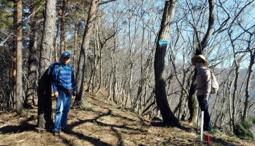 2023年02月06日のお山めぐりは群馬県みどり市の駒見山です。 小平の里親水公園の駐車場から9時45分に出発、鍾乳洞公園下に戻り、左に舗装路を登って行きます。Y字路は右上へ、小川を挟んだ右には満開に近いロウバイ、そして鍾乳洞の入口が見えます。そちらは帰りに寄ることにして、先に進んだ舗装路は右に方向を変えると車止めがありますが、徒歩はそのまま進みます。 大きくM字型に進路を変えて、目標の尾根直下で右に方向を変えるころに正面の尾根に取り付きます。V字の峠は桜峠というらしいが名板はなし、そさくさと左上に主尾根を登って行きます。植林地内の登りはとてつもない急登で、しばらくぶりの四駆に変わり、登り切って右に方向を変えます。 |