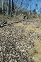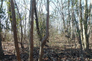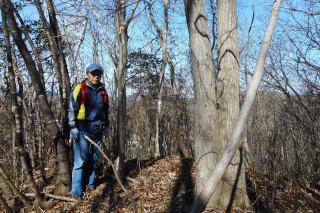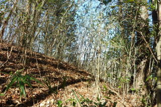 | 踏み跡か獣道か、右上の尾根右端へ出て左上へ笹薮を分けると杉の太い境木らしきものが連続し、その左に再び踏み跡が現れました。道は山頂に近づくにつれて右上へ方向を変え、植林地の最上部に出ます。山頂は左上です。 道型を 再び出てきた道型 植林地最上部へ ![]() 雑木帯でシノダケに覆われた山頂は40~50畳の平らな山頂の北側は少し高くなっており、ひょっとしたらお社でもあったのでしょうか。北側には雑木越しに送電線鉄塔が目に入りました。 山頂にて 山頂は平ら ![]() 帰路は北に薮斜面を下りますが、ツル、トゲ、シノダケ薮の三重奏、左に右に薮の薄いところを求め、トゲのあるイバラは踏みつぶします。無事に鉄塔敷に飛び出してホッとしました。右(東)に巡視路を下り、去年下った舗装路を辿り、去年のランチ場所の簡易水道施設前でさっきのピークを眺めてエネルギー補給です。 鉄塔敷の展望 水道施設前から権現山 ![]() おあとは昼時で人影がない集落の間を下り、遠く八幡山、右に権現山を見ながら下ります。駐車場所には12時08分の到着でした。 町営駐車場()キャンプ場駐車場跡()権現山()簡易水道施設()町営駐車場 所要時間は1時間53分(歩行1時間45分)、展望・薮・廃遊歩道探索の小さな無名峰ピークハントでした。 |