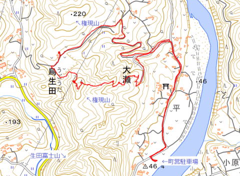 | 2023年02月09日のお山めぐりは茂木町大瀬の権現山です。 大瀬のヤナ近くの町営駐車場から10時15分に出発、北上してたかお神社脇を通過します。前回もお話を伺った老女から情報収集、鎌倉山も権現山というようですが、キャンプ場の位置を教えてもらってリスタートです。集落を過ぎて丁字路分岐は去年下ってきた左側の舗装路へ入り、次の丁字路で左上に向かいます。 登りになってすぐに車止めの鎖の左端から奥に向かい、往時駐車場だった広場の右端の道型を登ります。左に「はねつるべ井戸」の案内板と井戸を見てその先の階段を左上へ、そして右上、左上と登って行きます。最上部で道は左へ下り気味になり、その地点から右上に直登で支尾根の左端奥で消失でした。 |
