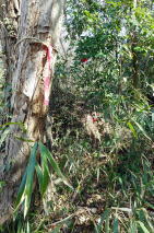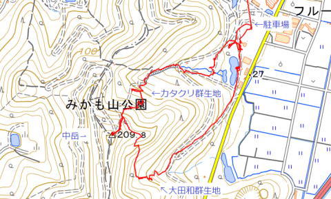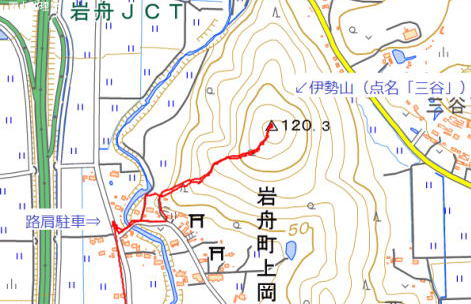 | ② 伊勢山(120.3m) 点名「三谷」・別名「愛宕山」「岩舟三谷山」) 2023年03月14日午後のお山めぐりは栃木市の地形図無名峰・伊勢山(点名「三谷」)です。 お山の南西の広い幹線道路路肩に駐車し、12時38分に東に向けて出発、橋を渡ってすぐに左に舗装路を入り、南西尾根末端に取り付きます。小藪の尾根に赤いツバキが咲いています。ほんの少し下った鞍部には右から道型が登ってきており尾根上を進んでいます。 伊勢山目指して 尾根末端に赤テープ シノダケ繁茂 ![]() 道型は右に下り気味になりますが、境界杭のある小藪の切り開けをが直進で登って行きます。シノダケが密になり、すぐに常緑低木帯、そして傾斜が緩んで山頂到着でした。 山頂にて 愛宕山の名板はなし ![]() 帰路は往路を忠実に戻り、鞍部で左(南)に舗装路を下ります。集落内の幹線道路に出て右へ、駐車場所には13時12分の到着でした。 所要時間は34分、小藪のピークハントでした。 GPS軌跡図(カシミール3D使用) ![]() 山名は今昔マップの明治時代の地形図から「伊勢山」としましたが、現地で確認はしていません。ヤマレコでは「愛宕山(字名から)」「岩舟三谷山(出所不明)」と記されていました。 |