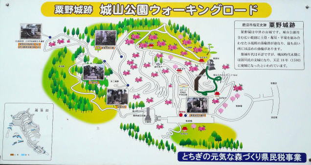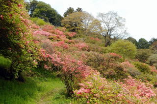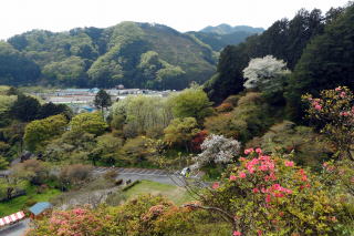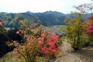 | 2023年04月12日のお山めぐりは旧粟野町の城山(粟野城跡)です。 商工会先の案内板に従って城山公園下の駐車場へ入って行きます。上の駐車場は1台、下はS&Pのロッキーのみで10時05分に出発です。前回は南端の展望台経由でしたが、今回はツツジ満開の南斜面をジグザグに直登するルートにしました。ツツジといい、180度の展望といい、こちらが正解ルートのようです。 最高地点の女二城近くになると、数が少ないものの満開に近いミツバツツジが咲いていました。 ほぼ満開のツツジ 上部の駐車場方向 ![]() 最高点から奥に進むと先客の男性に追いつきました。S&Pは一路城山の山頂へ、男性は左の植林内の下降ルートを選択したようです。登り返して分岐は右上へ、反時計周りに尾根上に着いた伏木の階段の遊歩道を登って行きます。 尾根の右端は金網で仕切られています。尾根の右越しに懐かしの三つの峰が集まっている三峰山が目に入りました。 最高点から口粟野市街 右に三峰山 ![]() ツツジに囲まれた山頂で小休憩で少しだけエネルギー補給です。今年は当たり年かアオダモの白い花が咲いていました。山頂の「城山」の石碑、「口粟野防空監視哨」を見て撤収です。 山頂から西方面 口粟野防空監視哨 ![]() 案内板から植林帯は樹齢100年以上の杉桧で永久非伐採になっているとのことでした。ジグザグにゆるく下る遊歩道から3台止まっている上部の駐車場を通過、下の駐車場には11時00分の到着でした。 所要時間は55分(歩行48分)、展望・ツツジの城山散歩でした。 ![]() つつじ祭りは4月16日から23日の1週間、12日現在ツツジはほぼ満開に近い状態でした。 |