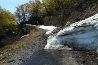 | 2023年04月23日のお山めぐりは旧山古志村の金倉山です。 宇都宮を4時少しに出発、佐野で朝食を入れて5時01分にリスタート、北関東道に乗り、堀之内ICを出て、駐車場所の山古志中学校奥の幅広路肩に駐車し、8時28分に出発し、同中学校の北に下り、棚田・養魚池に向かいます。雪解けの路肩に望外の濃い青のキクザキイチゲ、オオバキスミレ、カタクリの集団を見ます。 幅広路肩に駐車 濃い青のキクザキイチゲ ![]() 下る途中の路肩からは今日登る金倉山は青空の下にそびえています。下りきって登り返しにジグザグ道、登り切って右上、そして左上に進んで養魚場脇を通過し右上に道が方向を変えます。 虫亀の集落から左に進んだ路肩右上斜面にはクサボケの鮮やかな赤、フジの白花が咲いています。民家を過ぎて植林帯を通過し、右側の斜面にはオオバキスミレ、白のイカリソウ、カタクリが目に入りました。ここからは遮るもののない舗装路の登り、左に山古志の羽黒山から焼山、右奥に越後三山の白嶺が浮かんでいます。 登ってきたジグザグ道と養魚池群 オオバキスミレ ![]() 左右に展望の舗装路の先は「薬師の陵」と呼ばれる景勝地ですが、帰りに寄ることにして分岐は直進です。舗装路は右へ方向を変え、路肩の斜面にはオオバキスミレ、水色のキクザキイチゲ、エゾエンゴサク、カタクリが次々と出てきます。 薬師の丘から 薬師の陵 ![]() 新潟ナンバーの軽が一台停まっており、左上の斜面に山菜採りらしき人が目に入りました。朝5時の朝食なのでおなかがペコペコ、金倉の棚田の中央部で展望を肴にエネルギー補給の小休憩でザックを置きます。今日の天気は大当たり、SCWでは曇りの予想ですが、頭上は青空でした。 舗装路から右の展望 ランチ場所から越後三山 ![]() リスタートして右上から左上に方向を変えて、金倉の棚田の上部を通過しますが、ここからの展望も秀逸でした。 舗装路には残雪が半分以上を覆い、右に方向を変えて主尾根を北西に横断し、主尾根の北側を南西に進みます。右側斜面にショウジョウバカマ、オオバキスミレ、ダンコウバイ、タムシバ、山桜が咲いています。 金倉の棚田と越後三山方面 除雪未了の金倉林道 ![]() 雪に覆われた舗装林道を進み、10時41分、正面に建物の立つ広場に出ると、右(西)に展望が広がっています。そさくさと撤収、反対側の杉の斜面に付いた登山道に入ります。右に左にジグザグ登り、3箇所雪で倒れた杉の木を跨いでくぐって通過、11時05分に石仏、三角点、大きな展望台のある金倉山に到着でした。 登山口の広場 山頂へ ![]() 展望台からは360度のパノラマですが、遠くは霞んでいました。静止画像と動画をデジカメに収め、お湯を沸かしてフランスパンとミルクティーの軽いランチです。 展望台から ↓守門岳 ↓浅草 ↓越後三山 ![]() 帰路は往路を戻ります。金倉の棚田上部には車が3台、いずれも山菜採りでウドなどの戦果が目に入りました。午後になって少し風が強くなってきました。薬師の陵でパノラマをデジカメに収め、虫亀の集落に入ってすぐに左に進んで小さなピークの諏訪神社へ、2対の狛ちゃんに御挨拶でした。 1年ぶりのタムシバ 三角点と石仏 ![]() おあとは虫亀の集落に戻り、右下の「こばやしや」の看板と建物を見て水平移動、山古志中学校手前で石動神社に寄ってから14時02分に駐車場所到着でした。 駐車場所(1:12)薬師の陵(0:48)金倉山登山口(0:11)山頂(0:09)同登山口(0:43)薬師の陵(0:16)諏訪神社(0:41)石動神社(0:05)駐車場所 所要時間は5時間04分(歩行4時間05分)、展望・スプリングエフェメラル探索のピークハントでした。 |