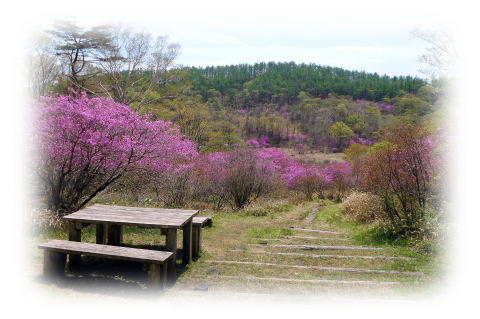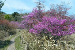 象の鼻からの展望もナイス、ロッジに戻る途中のシロヤシオも半分以上開花、放牧が始まっていない牧場内の砂利道をのんびり戻ります。最初の分岐で砂利道ではなく右上の斜面の道を選択、展望を見ながら駐車場所には12時41分の到着でした。 所要時間は2時間22分(歩行2時間02分)、展望・ミツバツツジ満開の周遊ピークハントでした。 |