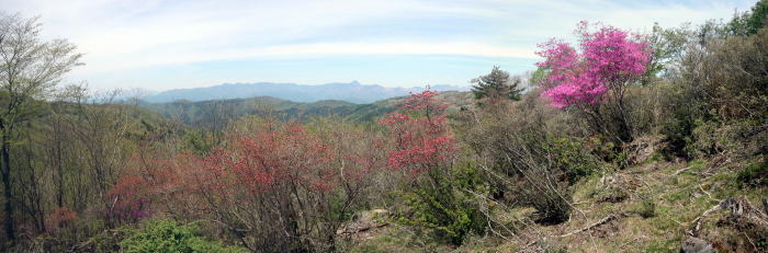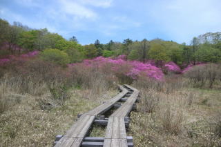 2023年05月09日のお山めぐりは横根山と井戸湿原です。 前日光牧場・前日光ハイランドロッジ下の駐車場から10時19分に出発、ロッジ前を通過し横根山に向かいます。足元には花茎のほとんどないタンポポが満開、左上の尾根上にはミツバツツジの紫が目立ち、右下のシロヤシオが白い花をつけており、今日は期待できます。 最初の分岐で牧場内の道路を離れて左の尾根の登山道に入りますが、早くも左右・頭上に満開のミツバツツジの出迎えです。いつもの横根山直下の展望所からパノラマをデジカメに収めます。 直下から袈裟丸連峰・皇海山方面のパノラマ ![]() 無人の山頂はそさくさと通過、南に下りますが、登山道沿いはミツバツツジのオンパレード、途中からシロヤシオも加わります。 鹿除け柵を通過し、いつものランチ場所に出ると冒頭画像のとおりのパノラマが目に入りました。今日はいちばんいい時に当たったようで、展望を肴にランチ休憩としました。最前のテーブルベンチの4名の男女が去り、新たに2名の男女が入ると同時に私たちも撤収、湿原に下ります。 ミツバツツジのトンネル シロヤシオも開花 ![]() 湿原中央部からの景色もいつもより華やかでした。今日は3時には戻らなくてはならず、五段の滝方面はパス、象の鼻へ向かいますが、こちらもミツバツツジは満開でした。 |