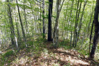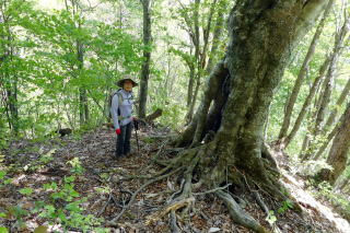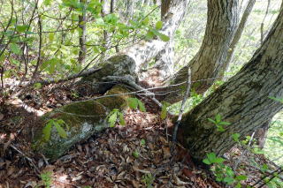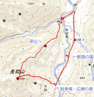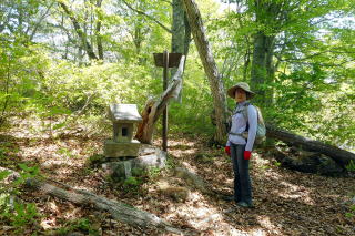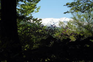 右下からの支尾根と合流し、少々下ってから登り返しはまた急登でトラロープ5箇所を通過します。トラロープ5か所目の上は大きなブナでした。だんだん傾斜が緩んできて、右下・熊野神社からのルートと合流し左上に進んで行きます。 3つ目のロープ 5つ目のロープ上の大ブナ 登山道分岐 ![]() 傾斜が緩んで10時21分、石祠一基の長卸山(1068m)の山頂でした。尾根の南側と西側はミツバツツジ、北と東はムラサキヤシオが咲いていました。ちょっとだけ窓が開いていて三岩岳という白峰が浮かんでいました。 長卸山の山頂にて 窓から三岩岳 ![]() 帰路は分岐まで戻り、左の熊野神社に下ることにしました。最初は急降下ですが、すぐに傾斜が緩み、五葉松の尾根、雑木帯、再び五葉松、そして若ブナ帯の辺りが「室山」か?俗にいうブナの美人林の辺りが「室山」でしょうか。その尾根先で左に曲がって下り、熊野神社(別名「室山熊野神社」)のお社に飛び出しました。 若ブナの尾根 熊野神社 ![]() おあとは急な石段を下り、再びお社前を通過し右に橋を渡ります。橋梁近くのムラサキヤシオは色が鮮明で橋の上でランチ小休憩です。まだまだ緑が浅い南会津ですが顔の周りを小さな羽虫がまとわりつきます。 幹線道路に出て右折、少し歩いて右に歓満の滝の案内板でちょっと覗いてみることにしました。残念ながら歩道が壊れて途中からの滝の遠景でした。幹線道路に戻って右上の下ってきた尾根、右が室山でしょうか。その先で冒頭画像の長卸山のピークが目に入りました。駐車場所には12時16分の到着でした。 所要時間は2時間59分(歩行2時間27分)、望外のミツバツツジ、小さなピーク、春の奥会津の散策でした。 参考 国土地理院電子地形図「桧枝岐」 室山の山名は「山と私と山名辞典」さんから |