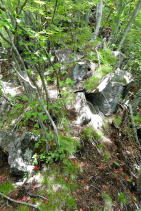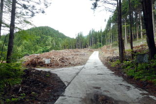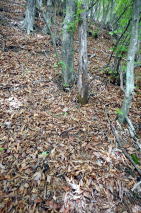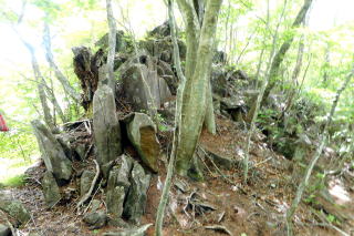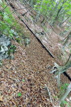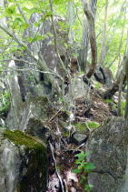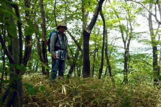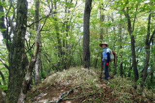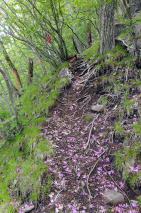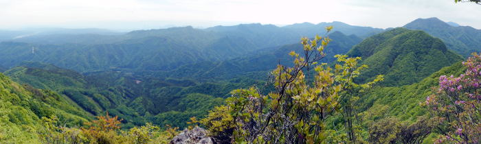 | 2023年05月25日のお山めぐりは群馬県高崎市(旧倉渕村)の笹塒山(ささとややま)にしました。 登山口となる滑川林道入口右の駐車スペースは誰もいません。山支度中に軽のワゴンが一台、林道に入って行きます。よく見れば反対側にも駐車スペースがあり、一台停まっていました。8時38分に出発、ヒカリゴケの案内板を見て林道を登って行きます。道端にはハルジオン、ヤブジラミなどが咲いています。 ジグザグに高度を上げて、数台車の停まっているところは森林整備中の伐採斜面で何名かがチェーンソーほか作業中でした。左に方向を変えて右上の男性に会釈しご挨拶です。 駐車場所 ヒカリゴケの案内板 ![]() 左上に進んで支尾根を越えて右へ進むと左右が開けた伐採地、左に分けるコンクリート道はヒカリゴケ方面、上部に進んで、左に展望が開けて中垣岩か、変わった山容の山々が目に入ってきました。 左はヒカリゴケ方面 少し上から雨ん坊主山・中垣岩か ![]() 樹林帯に入り、破線路らしき道型を左に見て今日は林道を選択、右上に直角に曲がり、さっきの支尾根上部を越えて左に回りこみ、分岐は左上にキックバックで登って行きます。支尾根を左から右に回り込む地点にあるカーブミラー、ここが下の破線路からの登り道(地元通称「旧道」で実線路は「新道」)のようです。 そのあと3本の支尾根を回り込んで直進の道型が消えて9時53分、右上にキックバックで登り、支尾根に復帰して左上に幅広道型が進んでいました。10時18分に尾根上に大きな岩が現れると約6分間岩尾根との格闘です。足元にヤマツツジの花びらを踏んで急登が始まります。 岩尾根 急登 結構ワイルド ![]() 圧巻は1250m標高線の岩尾根下の通過です。最初は小さくジグザグ登り、次いで大きく左上へ、さらに右上にトラバース気味に進んで支尾根を回り込んで行き、踏み跡が下りになる直前にPさんが赤テープを発見しました。ここから樹木の多い斜面の急登で無事、登りの尾根に復帰しました。 ヤマツツジの花びら 尾根の右 左上へ直登 ミツバツツジの花びら ![]() 急登が始まり、ミツバツツジの花びらを踏んで登り切った地点が1402m評点で小さな板(⇀3分と読める)が一枚、お待ちでした。とりあえず西のピークに向かってみました。東西尾根上は終盤のミツバツツジ、盛期に近いヤマツツジがあります。11時33分到着のピークには「すかいさん名板」ほか一枚がお待ちでした。 1402m峰にて 西峰にて ![]() さて、本峰を越えて東峰でランチとしましょう。ということでそさくさと撤収、再訪となった1402m峰を越えます。少し下って緩い登りで到着の東峰には大きな名板と小さな石祠が鎮座していました。南に下ると左は榛名山・南に雨ん坊主・角落山・鼻曲山からお隣の竜ヶ岳・その右奥に浅間隠山の展望が広がっていました。 東峰の石祠 東峰にて ![]() 東峰直下の展望所から ![]() 展望所滞留中にヘリコプターの音が大きくなり、東から西に飛んでいきました。遭難でもあったのでしょうか。12時25分に撤収、東に下ります。1350mピークへの登り返し、1010mピークへの登り返しのほかは下り一方ですが、一か所、1010mピーク手前の1070m付近で右下に尾根を外して修正しました。 標高940m付近で右下に曲がる地点は黄色テープが2つ誘ってくれます。やはり林道への下り地点は斜度があり、下れるのは一点だけでした。おあとは林道を右に戻るだけですが、一か所10分ほどの登りが予定外でした。駐車場所には14時43分の到着でした。 駐車場所(0:23)展望伐採地(0:19)林道分岐(2:01)1402m評点ピーク(0:08)西峰(0:08)1402m評点ピーク(0:04)東峰(1:05)林道(0:40)林道分岐(0:33)駐車場所 所要時間は6時間04分(歩行5時間21分)、ツツジと山頂直下展望の周遊ピークハントでした。 GPS軌跡図(カシミール3D使用) ![]() |
