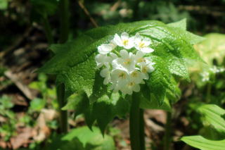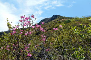 緩いアップダウンの登山道の両脇は足元に終期に近いヤマハタザオ、タチツボスミレ、まだツボミのマイヅルソウ、目線の高さに点々と満開のムラサキヤシオ、眩いばかりの黄緑はダケカンバのようです。