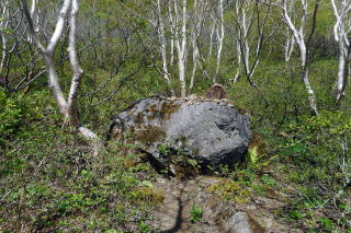 沼の平に近づいて左側奥に緑のヒロハユキザサの若芽、その脇に白い可憐な花弁のサンカヨウが咲いていました。ここで下ってくる女性ハイカーとスライド、さらに先の沼の平の石碑地点で後攻の老ハイカーに先を譲ります。