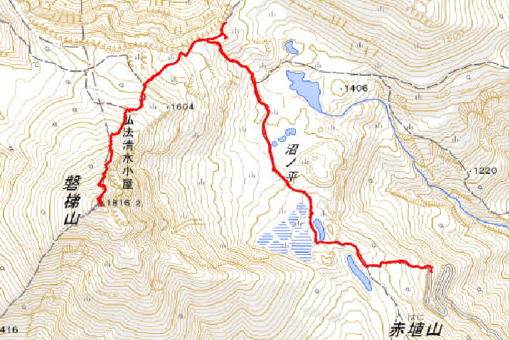 弘法清水でのどを潤し、鐘を一つならして左上の伏木の階段道に入ります。傾斜が緩んで尾根に乗って右に直角に曲がる地点からは直下に沼の平・赤埴山方面が目に入ります。