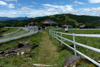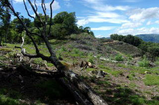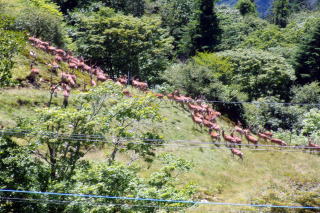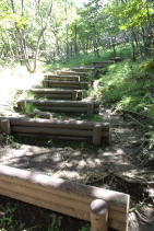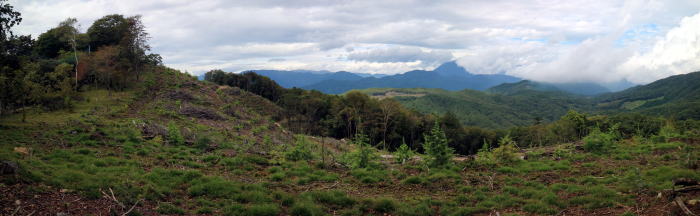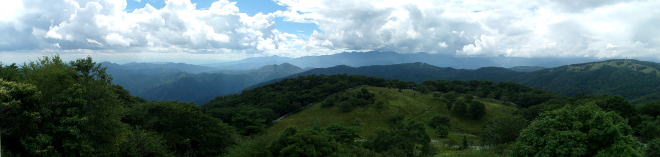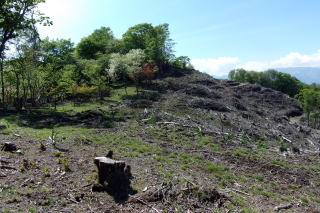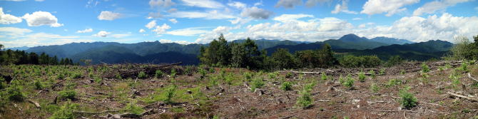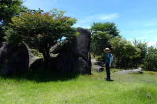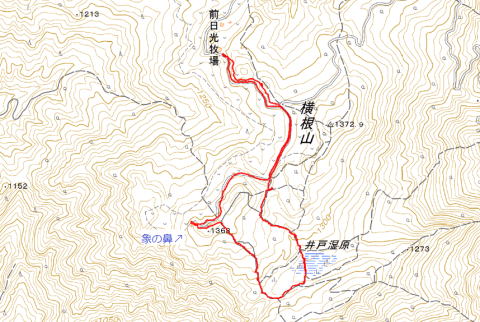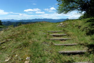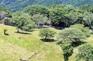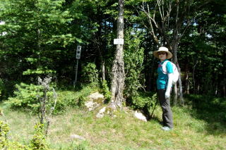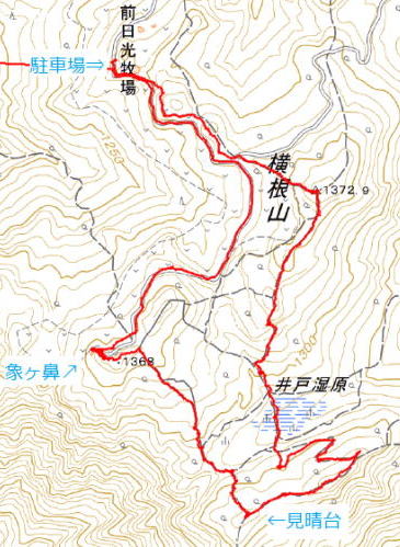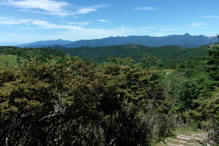 ③ 方塞山から横根山・勝雲山 編 2024年07月29日のお山めぐりは方塞山・横根山・勝雲山です。 今日は朝から快晴、そろそろ茨城・福島のシキンカラマツと思ったが、気温はうなぎのぼりのようで、予定変更で標高を上げることにしました。 前日光ハイランドロッジ(以下「ロッジ」と略します。)入口の丁字路北東約100mの路肩に駐車し、8時44分に出発です。丁字路手前から東に明瞭な道型を登って行きます。右に見える牧場の鉄条網が傾斜が緩んだのを示し、少し進んで北東に方向を変えます。まもなく右が開けて牧柵の奥に展望が開け、富士山が顔を出してくれました。 駐車場所と登り口 右に富士山 ![]() さらに登って左背後に間伐された木々の向こうに足尾の山々、右にこの後向かう横根山方面が目に入りました。牧柵脇を登って9時14分に名板のある方塞山(1388m)に到着、牧柵の先に展望が開け、再び富士山が目に入りました。 山頂から再び富士山 方塞山の山頂にて ![]() 撤収して東へそして南に下ります。途中2か所のベンチ場所は牧柵越しに展望が広がり、富士山が望め、下のベンチ場先からは赤城連山が見えてきました。登山道に復帰し登り返しの左に杉の皮剥ぎはクマさんでしょう。下りきって右に牧場を横断する牧柵を見て直進、登山道の登り返しです。 右に赤城連山が見えてきた 登山道は登り返しへ ![]() 登り始めてやっと牛さんを見ました。牧柵から離れて樹林帯に入り、沢を渡る木橋、登り返しはピークを左から巻いて登ります。登り切って左へ下り、道路に飛び出しました。ここは砂利の丁字路をほんの少し東に入ったところで、反対側が横根山の登口です。 砂利道へ下って 横断して登りへ 伏木の階段道 ![]() いつもは横根山から下って来るところですが今日は登り返しです。山頂近くになって背後が開けて、赤城山から袈裟丸山・皇海山の展望が広がっていました。10時24分到着の山頂で小休憩として、山頂直下の展望所に行ってみることにしました。先ほどと同じ景色を再度デジカメに落としました 赤城連山・袈裟丸連峰・皇海山 山頂の山名柱 ![]() 9分の停滞で撤収、象の鼻に向かうことにしました。横根山から井戸湿原に向かう途中2つ目の分岐を見逃して井戸湿原方面に進んでしまったので東屋下のテーブルベンチでランチ休憩です。休憩中に井戸湿原から登ってきた男性1名は横根山方面に登って行きました。 この時期の井戸湿原は花は閑散期、少し戻って未踏のルートを象の鼻に向かって行くことにしました。1370mピークへの登りはけっこうな急登、登り切って左へ水平移動、そして下りになって仏岩の分岐で左に井戸湿原への道を見送って直進、11時43分に無人の象の鼻到着でした。 井戸湿原上のテーブルベンチ 象の鼻にて ![]() 象の鼻から南の展望は通っているものの富士山は雲に隠れてしまったようです。安蘇の山々、赤城山から日光男体山まで鮮明です。 象の鼻から赤城連山・袈裟丸連峰・皇海山 日光白根山から日光連山 ![]() 直下の牧場を見てみれば木の下の日影に20頭前後の鹿の群れが2箇所、よく見ればもう一か所、それより大きな樹木下に鹿の群れが見えます。 象の鼻から「勝雲山」 木陰に鹿3群 ![]() 展望をデジカメに収めていると同年配の男女のハイカーが到着、入れ替わりに撤収、砂利道をロッジへ向かって下ることにしました。砂利道の左右に牛さんを見るようになって往路の横根山の登り口の丁字路です。さて左に砂利道を行くか、正面の牧場内の登りにとるかPさんと協議、正面に進むことにしました。ここからは実にミニ展望コースでした。 少し登ってこの景色 ロッジ・皇海山目指して ![]() ロッジ前の駐車場には車が3台、来訪者はかなり少ないようです。ロッジ前を通過し、舗装路歩きで最低鞍部の通路前を通過、左上に方向を変えて左に展望をデジカメに収めている手前下の斜面に鹿の群れが見えます。そのうちにS&Pの話し声が引き金か?鹿の群れが動き出しました。帰宅して鹿を数えたら90頭を越えていました。 鹿が続々逃げる(1) 同(2) ![]() 鹿がいなくなったので撤収、ロッジ入口の丁字路に向かい、樹林帯に舗装路を登って行きます。ジグザグになって丁字路分岐から左に舗装路を緩く登り、いったん下って伐採地の中から登り返して右の駐車場入り口を通過します。右側が再び伐採地で展望が開ける中、帰路の戻る作業道の出入り口を通過し、右側の伐採地との境に付いた踏み跡に入ります。 勝雲山は右へ登る ここで右の山頂へ ![]() 階段道を登り切って道は左へ進み、途中から右側の伐採地に沿って登る尾根を辿ります。左雑木、右伐採地の尾根上にある最高地点が勝雲山でしょうが、山レポも1322m、地形図も三角点の1322.2mの北側に表示があります。(GPSデータからは三角点より7m高いようです。) 伐採地からは日光男体山から横根山方面、三角点の北西の伐採地斜面からは下図「①」の赤城山・袈裟丸連峰、奥日光の山々、下図「②」日光連山まで展望が広がります。パノラマ