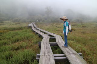④ 8.12 方塞山から横根山・井戸湿原 編 お盆の間は雨マークが連続、どうやら台風が再来らしい。奥日光方面もてんきとくらし(以下「てんくら」と略します。)Cで、午後3時まではAで1000m以上は・・・。 2024年8月12日のお山めぐりは前回の方塞山から横根山ですが、そろそろあの花が咲いていそうな井戸湿原で、登山口となる前日光ハイランドロッジ(以下「ロッジ」と略します。)入口から西に100mほどの空地に駐車し10時47分に出発です。 湿原荘跡までは前回と同じですが、今日は井戸湿原に降りてから象の鼻に向かうことにしました。相変わらず不人気の方塞山はS&Pのみ、今日の天気では富士山は見えません。一つ下のベンチの場所でランチ休憩ですが、雨がポツポツときました。最低鞍部の分岐で鳩首会談(笑)、てんくらAを信じて横根山へ向かいますが、ロッジからは元気な子供の声が聞こえていました。 雨が止んできた横根山の東屋でひと息入れて、横根山から湿原荘ですが、獣除け柵で男女2名とスライド、井戸湿原に降りて親子らしき男女とスライド、サギソウ、メタカラコウ、ノコギリソウ、ウスユキソウ、ナンタイブシほかを見て、湿原から象の鼻へ向かいます。 サギソウ メタカラコウ ![]() 反時計周りが原則のS&Pなのでこちらから登り返しは新鮮です。象の鼻展望台でパノラマをデジカメに収めてそさくさと撤収、砂利道をロッジに向かいます。ロッジ前の駐車場は満杯ですが、下はがら空き、まあこの天候ではそうでしょうねえ。 象の鼻展望台から ![]() 前回の鹿がいっぱいいた場所は今日は皆無、そういえば象の鼻展望台下でも鹿は見ませんでした。おあとは車ではアッという間の車道歩きですが、けっこう時間がかかります。駐車場所には14時55分の到着でした。 駐車場所(0:01)登山口(0:29)方塞山(0:51)横根山登山口(0:11)横根山(0:16)湿原荘跡地(0:33)象の鼻(0:20)ロッジ(0:25)ロッジ入口の丁字路(0:01)駐車場所 所要時間は4時間08分(歩行3時間07分)、暑さ避け・お花探索の周遊ピークハントでした。 |
