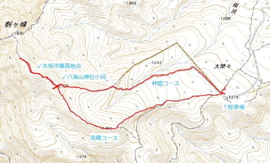 | 2024年05月25日のお山めぐりは、矢板市の最高峰と八海山神社ピークです。 今日は平日金曜日、残り4台の大間々台駐車場から9時39分に出発、トイレ左奥の案内板を見て未踏の林間コースを選択、ヤマツツジ満開の登山道は防火帯でしょうか、盛り上がった土手の左側を緩く下って行きます。左に方向を変え、枯れ沢2本を下って登り返しになり、「←八海山神社1.6km・大間々0.4km→」の板を見ます。 二股の杉、連続する木柱、赤テープが進行方向を誘います。2人の男女とスライドします。「←八海山神社1.4km・大間々0.6km→」の木柱と両側の木に赤テープ、まるで門柱を暗示するように左上へ誘い、そして右上に登山道が伸びています。 登山道にはヤマツツジ 八海山神社1.4kmの木柱 ![]() 3本目の沢は桜沢で、トラロープが枯れた沢底へ誘い、登り返しは石段、伏木の階段道のジグザグ登りになり、東西尾根に出ます。「←八海山神社0.7km・大間々1.3km→」の板を見て左上に尾根の左側を登って行きます。 尾根上はシロヤシオの木が連続しますが、花芽は皆無でした。2名の男女、2名の男性と相次いでスライド、登り切った地点が八海山神社のピークでした。南西側斜面の下部に見える鮮やかなミツバツツジは帰りに寄ることにして、展望をデジカメに収めて右上の矢板市最高峰の無名ピークに向かいます。 尾根の左側を 八海山神社ピークへ ![]() いったん下降ですが、左右にやっと白い花芽のついたシロヤシオが1本ずつ、登り切ってしばらくぶりの1590m地形図無名峰でした。奥に下って展望地を目指しますが途中で左に高原山を見て撤収、八海山神社ピークでランチ休憩にすることにしました。 やっとシロヤシオが 1590mピークにて ![]() 先ほどは無人のピークでしたが、今は上部で2人の男性が大声で話をしており、2人の男女が登ってきました。S&Pは南西斜面を少し下ったところの平らな石板?でコーヒーを沸かして大休憩です。曇り気味になった空模様の合間にさす日の光を待って対岸の尾根のダケカンバかな、黄緑色が浮かぶのを待ってデジカメに収めます。 高原山塊 ダケカンバ?の尾根 ![]() ランチ後に少し下った斜面のミツバツツジをデジカメに収め、ランチ場所に戻ります。帽子を顔に載せて寝転んでみました。下界は30度か、ほんのり風も出ていて、いい気分でした。 斜面下部のミツバツツジ 矢板市最高点ピーク ![]() おあとは見晴コースを下ります。まだまだハイカーが登ってきます。ときどき背後を見て高原山塊を確認します。右下にミツモチ方面分岐を通過、次いで尾根を離れて左下へ下り、木の鳥居をくぐります。未舗装の砂利道を左へ進んで大間々駐車場には12時51分の到着でした。 所要時間は3時間12分(歩行2時間25分)、展望のランチハイクでした。 駐車場(1:05)八海山神社ピーク(0:14)矢板市最高地点ピーク(0:09)八海山神社ピーク(0:39)木の鳥居の登山口(0:18)駐車場 |