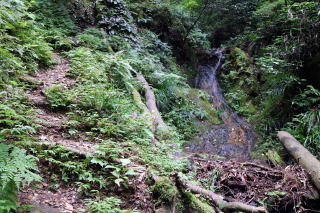 | 2024年08月07日のお山めぐりは令和に入ってお初の雨巻山です。 大川戸登山者専用駐車場(以下「駐車場」と略します。)から10時01分に出発ですが、下ってきた男性はモスキートネットを被っていました。沢コースに向かう砂利道の左側はイノシシと思しき耕うん跡が一杯あり、樹林帯に入ると音を立てて小さな虫が顔の周りに集まってきました。 足元にハグロソウが現れますが、民家を過ぎたところでたまらずモスキートネットを被ります。 駐車場から出発 ハグロソウ ![]() 分岐を二つ見送って沢沿いの踏み跡から沢中を登り、右岸を登る鎖場には花をいっぱいつけたイワタバコが並んでいます。妙に緊張感を味わって登り切り、倒木の下をくぐって再びイワタバコのある岩壁を通過します。 さあ次は水場を過ぎれば沢は終了ですが、ここからがけっこう長かった。記憶のなくなった2つ目の鎖場を通過し水場で小休憩、ペットボトルに冷たい水を入れ替えます。 鎖場へ イワタバコ ![]() おあとは左上に明瞭なジグザグ道を登るだけです。尾根に登り切って右上へ、テーブルベンチがいっぱいある雨巻山の山頂でした。山頂は26℃、急に風が出てきて涼しいなと思っていたらポツポツ雨粒が落ちてきましたが、それ以上は降りませんでした。 山頂へ 一角が開けて ![]() 帰路はいつもの尾根コースではなく、2度目のメインコースを下ることにしました。山頂直下で男性とスライド、尾根分岐を通過し、次のメインコース分岐手前にベンチ2基の展望地があり、小休憩で展望をデジカメに収めます。 左右にベンチ1基ずつ 展望は遠くは望めず ![]() メインコース分岐で右下へ、手入れのいい登山道を下り、往路に出ます。やはり小さな虫が集まり始めたので、モスキートネットを被り、白花ハグロソウ探索でいくつか白花をデジカメに収めました。 大川戸鉱泉の建物、次いで民家前を通過します。私たちの車を含めて3台駐車の駐車場には13時21分の到着でした。 駐車場(0:42)沢コース・尾根コース分岐(1:00)雨巻山(0:26)三登谷山・メインコース分岐(0:14)雨巻山・メインコース分岐(0:30)駐車場 所要時間は3時間20分(歩行2時間52分)、イワタバコ鑑賞のピークハントでした。 上記2種のほかにフジカンゾウ・ヤブラン・トウバナ・ダイコンソウ・ヤマイモ・ナツノタムラソウ・ゲンノショウコ・キンミズヒキ・ミズタマソウ・ヤブミョウガ・ムラサキニガナなどが咲いていました。 |