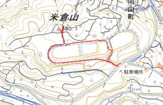 2024年09月25日、午後のお山めぐりは山梨県でいちばん低い地形図記載の米倉山(こめくらやま)です。 米倉山の南下にある太陽光発電所入口の丁字路路肩に駐車し出発です。最初は東に進んでみますが施設のようで丁字路に戻ってヤマップレポのとおり舗装路を北上します。すぐに右に入る道型、施設の金網の左側を登り、小広場(反対側「次世代エネルギーPR施設きらっと」からも道)に出て左上の階段を登って行きます。 登り切っってさらにもう一段左上に階段を登ると展望台があり、南に180度の展望が広がっていました。(残念遠くは雲で×)北上して東西の砂利道に出て左へ進み、地形図実線の丁字路で右(北)に緩く登ります。最高点が米倉山三角点のはずでしが薮に囲まれているようです。 山頂へ 畑地の奥にはスズメバチ ![]() 南側の畑地から目指しますが、スズメバチが一匹屯しています。ひょっとしたら巣があるかも・・・。ということでハチアレルギーのしぼれは退散です。GPS軌跡図で見るとおり三角点近くまで来ているので登頂ということにしました。 駐車場所(0:06)展望台(0:04)丁字路(0:03)山頂(0:02)丁字路(0:10)駐車場所 所要時間は30分(歩行25分)、小さなピークハントでした。 |