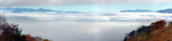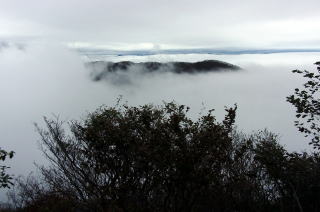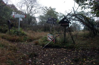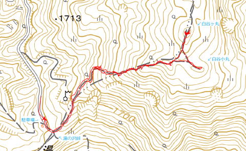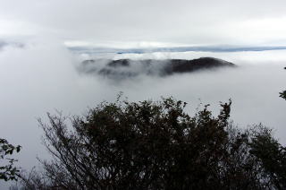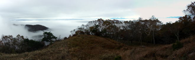 | 2024年10月20日のお山めぐりは湯の沢峠を起点に白谷ノ丸・大蔵高丸・ハマイバ丸としました。 最後の1台のスペースに無事到着のS&P、8時19分に出発、2分で湯の沢峠の十字路へ、まずは左の白谷ノ丸です。登山道は明瞭、尾根沿いに直登から尾根筋を離れて左上へ登り、途中から右上に小さくジグザグ登りで尾根に復帰します。 湯の沢峠駐車場 湯の沢峠へ ![]() 8時58分、右の木の間から雲海に包まれつつある大蔵高丸・ハマイバ丸が船のようにも見えます。 ハマイバ丸・大蔵高丸・8時58分 同9時00分 ![]() いったん緩んで広場状の地点の上部から背後に上下とも雲海に挟まれた大蔵高丸から南アルプス、そして八ヶ岳方面のパノラマが目に入りました。残念ながら今回も富士山には振られたようです。 9時17分 ↙大蔵高丸 南アルプス 八ヶ岳 ![]() 緩い登りでピークというより丘かな、正面に白谷ノ丸、右に雲に包まれつつある白谷小丸が見えます。数名の男女とスライド、少し下って登り返しの途中で左に紅葉越しの展望が広がります。 9時32分 南アルプス 八ヶ岳 ![]() そこから4分で男性1人が憩う白谷ノ丸の山頂でした。山頂からは先ほどと同様の景色でした。 山頂にて 山頂の紅葉 ![]() 10時10分まで晴れを待っていましたが逆に雲に包まれてきたので撤収です。白谷小丸に向って往路を下り、途中から地形図破線路どおりの踏み跡を左に下って行きます。いやはや弱い霧雨になってきたようです。分岐は直進で登り返しになります。小石が積み重ねられた岩石が2つの山頂に到着ですが、展望は皆無でした。 そさくさと撤収、往路を戻ります。分岐で左を選択し下草で少々濡れ始めた足元、すぐに往路の登山道に合流して左上に登って行きます。無人の小ピークからは背後の白谷ノ丸は見えませんでした。 おあとは往路を戻るだけです。このあと展望所からは展望は望めませんでした。峠に下る途中で12人の男女とスライド、大峠辺りに車を待たせてあるのでしょうか?湯の沢峠駐車場には10時51分の到着、本日これまで・・・。霧雨で展望が望めない大蔵高丸・ハマイバ丸は次回に回すことにしました。 駐車場(1:12)白谷ノ丸(0:06)白谷小丸(0:37)駐車場 所要時間は2時間32分(歩行1時間49分) |