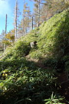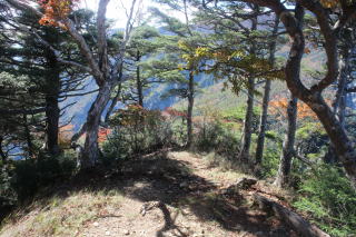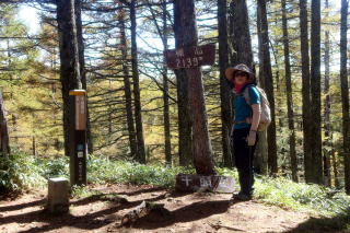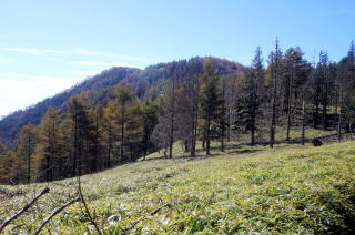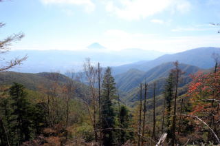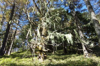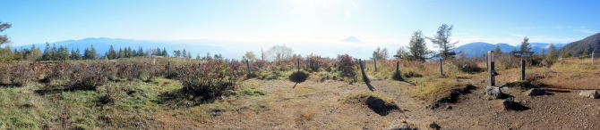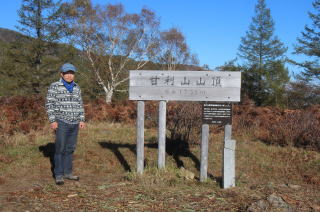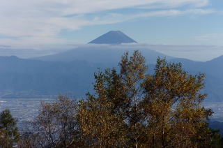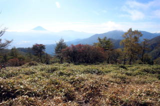 | 2024年10月21日のお山めぐりは山梨県韮崎市の甘利山から千頭星山です。 甘利山グリーンロッジ駐車場には7時35分の到着、山支度をして7時40分に出発まで後続車はありませんでした。 反時計周りがいいので、舗装路に出て右に進みます。少し登ってから下りになって左に甘利山への案内板があります。道は幅広、右の林にはサルオガセの付いたカラマツが見えます。 案内板に従って左へ 始まっていた紅葉 ![]() 道は左上へ方向を変えます。丁字路分岐は右上への道を見送って直進です。傾斜が緩んで次の分岐も直進で甘利山の山頂でした。誰もいない山頂でザックを置いて展望をデジカメに収めます。 山頂からは西に千頭星山から奥甘利山方面、北から南に金峰山方面から富士山、その右に9月に登った櫛形山のパノラマが広がっていました。風もほとんどなく、今日の山行きは当たりのようです。 甘利山にて 富士山 ![]() 金峰山方面から小さく富士山・櫛形山まで ![]() 分岐に戻って本日のメインイベント、千頭星山をデジカメに収めます。右下へ往路を見送って直進です。葉の落ちたツツジの灌木帯も周りの木々が高くなって、枝に下がったサルオガセが太陽光を反射していました。 樹林帯に入ると左の広葉樹が黄色になっています。下って視界が開けると左に千頭星山、正面に奥甘利山が目に入りました。左は大笹池の分岐で案内板に従って直進です。 奥甘利山 千頭星山 次の丁字路分岐は先ほどの往路からの道でしょう。登りになって登山道沿いにツツジの赤、背後には富士山が浮かんでいます。 さらに上部に登るとツツジと甘利山の全景と櫛形山、そして富士山のパノラマが広がっていました。笹原分ける登山道、左のカラマツに絡むサルオガセ、風は微風のままで、進行方向に千頭星山が見えます。 ↓甘利山 ↓富士山 ↓櫛形山 ![]() 傾斜が緩んだ次の分岐で案内板に従って右上の奥甘利山に登ってみました。富士山と雲がかかり始めた櫛形山が一望でした。登山道に復帰、進行方向の千頭星山方面にも雲がかかり始めていました。 奥甘利山 富士と櫛形山 ![]() 鞍部に下って笹原の右に八ヶ岳、左のカラマツ林越しに奥甘利山と富士山が見えます。ここからは左傾斜の急登ですが、ときおり富士山も千頭星山の一部が見えます。 いったん登り切って尾根に出て再び左斜面の登り返しです。再び傾斜が緩んで標高1970m付近の尾根に復帰、しばらくカラマツ林の尾根のプラトーで黄葉・紅葉を眺めながらのんびり歩きです。 急登 急登 左に富士山 ![]() さて、次は標高差80mの登りです。9分で右御所山への分岐を通過します。正面のピークを避けて左上に進む登山道、右側の老木に多数のサルオガセが下がっています。視界が開けて笹原の緩やかなアップダウンの登山道、右上にダケカンバか黄葉を見るようになると、正面青空の下に千頭星山が目に入ります。 老木のサルオガセ 笹原の向こうに千頭星山 ![]() 左の木の間にときおり富士山が顔を出します。日影の登山道に今年お初の霜柱、笹の葉の周りに霜が付いていました。日が当たって溶けた霜が登山道を濡らしているようです。登り傾斜になって右のダケカンバの黄葉の間に2つのピークは鳳凰山薬師岳のようです。 カラマツの老木の横になった枝から下がっているサルオガセ、その下を潜った先から最後の急登です。背後に八ヶ岳から金峰山方面のパノラマが広がっていました。樹林帯に入って右上へ進む登山道、あっけなく着いた千頭星山の山頂でした。 鳳凰山薬師岳 千頭星山の山頂にて ![]() ランチ休憩、でやる気復活、3番目に来た男女に丸太のベンチを譲って奥に下ってみました。ピークを越えて尾根を下った先にはツツジの紅葉、そして辻山・薬師岳が目に入りました。急いでデジカメに収めて戻りますが、末端からが最高だったようでした。( ;∀;) 尾根末端へ 鳳凰山薬師岳 ![]() 千頭星山に戻る途中で2番手に後から来た男性がランチ中でした。千頭星山に戻ると私たちを待って様子を見るといった3番手の男女は去ったようです。そうこうしているうちに男性3人組と入れ替わりに撤収、おあとは往路を戻るだけです。 直下の展望地で最後のパノラマを見て、足元を見ながら急降下、笹原に出て右に富士山が見える地点の左側笹斜面にランチ中の男女3名に御挨拶します。 大西峰(2065m)への薄い踏み分けが笹原についていますが、パスすることにしました。笹原を下り御所山分岐を通過し、下りは右斜面となった急降下、ときおり出てくる右の富士山、尾根道のプラトー状態を通過し再びの急降下、鞍部から登り返して奥甘利山分岐を通過します。 直下の展望地より「八ヶ岳から金峰山方面」 ![]() 展望の笹原斜面の下り、今日は雲がやや多くなったものの遠くの展望は午後も健在でした。 12時31分の富士山 甘利山下山道から最後の富士山 ![]() 甘利山に登り返して、ベンチでエネルギー補給の小休憩です。後続の3名が追い付いてきて入れ替わりに撤収、東に下ります。直下の
