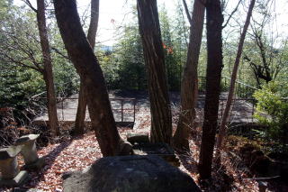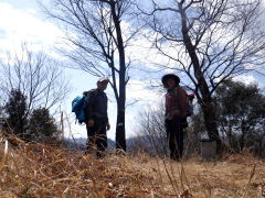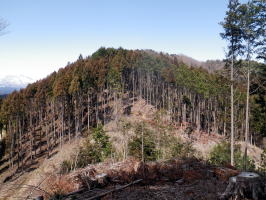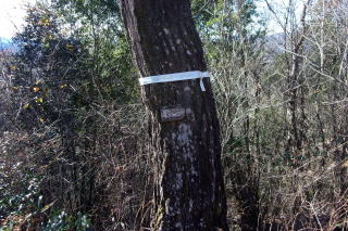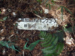 | 同地図の舗装路のふくらみは日光稜線紀行さんのレポのテニスコート脇で数台駐車可能で、ここに駐車し10時52分に出発です。 少し南下して尾根に入る道は見えず、日光稜線紀行さんのレポと同じくツルハシマークの板の左から杉林に入ります。最初は下草なし、尾根に出て左は実生の針葉樹、右側を選んで進んで行くと檜の若い植林地の手前で笹とイバラの藪、ここは薄そうな右から巻いて登りになると踏み跡が現れます。 東西にやや間延びした370m級ピークは11時14分の通過、西端で左下へ下ります。この辺りまで実線路のはずですが、まだまだ先に踏み跡が進んでいます。左の木の間にゴルフ場が見え隠れしています。尾根の凹凸に気をつけながら11時29分に再訪の山頂でした。 檜幼木林手前の藪 明るい尾根 高知山から板橋城山方面 ![]() ここは今日の目的へ向かって南に下ることにします。こちらは幅広明瞭な道、すぐに右に木の鳥居と石祠があります。尾根沿いの「高知山ハイキングコース」の案内板には雷電神社の文字があります。さらに下って伐採された鞍部ですが左下にゴルフ場のティーグランド、目の前に最近刻まれたような作業道のある尾根があります。 登り返した小ピークには石祠一基、南東に下るとトラロープが設置されています。下った鞍部には今日2つめの案内板、白い鉄管のガードレール(?)は東西に横断する道の左と直進尾根の右側を進んでいます。 緩い下りから登りになって尾根末端に石祠2基、中のひとつは羽の生えた石神、これは天狗でしょうか。その先11時44分に石祠に木の覆屋のある琴平神社到着です。その先には本格的な展望台があります。今ネットで確認してもこのコースは出てきません。ゴルフ場さんができる前なのでしょうか。 ティーグランド右の鞍部と進行尾根 展望台から南西の展望 ![]() ガードレールでこの先は隔離されているようで、高知山まで戻ることにしました。12時03分に山頂に戻り、証拠データをデジカメに収めますが、12年の経年変化ですねえ。日光方面がもっと見えたような・・・。。 前回と同様に少し戻ったところで西に下ります。よく見れば足元は伏木の階段ですね。下る途中で今日3つめの案内板、あらあらこれには観音山の文字、どこにあるのでしょうか。分譲地の道路末端に出て左へ、すぐに右折し幹線道路へ出て再度右折、道なりに戻って行きます。 山頂にて 分譲地手前の案内板 ![]() 駐車場所には12時43分の到着、エース君の前には大型トラックが休憩していました。ザックを下して身づくろい中に大きなくしゃみ、目も少ししょぼついてきました。花粉予想の黄色いゾーン、午後になって降ってきたのかもしれません。 所要時間は1時間51分(歩行1時間37分)、城郭探索、神社参拝、ちょい展望の山旅でした。 駐車場所(0:37)山頂(0:13)展望台(0:18)山頂(0:10)分譲地奥(0:19)駐車場所 参考 国土地理院旧25000分の1地形図「下野大沢」 日光稜線紀行さんのHP |