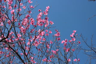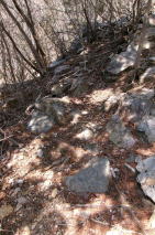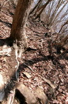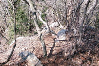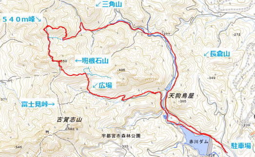 2025年03月26日のお山めぐりは古賀志山塊の一峰「班根石山」です。 今年のアカヤシオはどうだろうか。例年早めに開花の一本を見に行ってみることにしました。9時36分赤川ダム下駐車場から梅の花越しの古賀志山は春霞か。9時41分に出発、北上です。ダム湖畔のしだれ桜はもBBQ場の反対側にあるアカヤシオもまだまだです。しばらくぶりの古賀志山腹は植林帯の間伐で明るくなっていました。 駐車場から古賀志山 間伐済の植林地 ![]() 最初の分岐は右(直進)、細野ダム左岸を北上し、次のY字路は左へ進み橋を渡り直進です。次の分岐、石祠手前の分岐、沢コース入口の分岐も直進し、右の三角山への登り口のある分岐は左の舗装路に入ります。舗装路終点が入口で、木の橋を渡って登山道を登って行きます。左下は枯れた沢、登山道も枯れ沢のようです。 木の橋を 登路 ここで右へ ![]() 最初の丁字路分岐の直進は北尾根コースの鞍部でパス、右のマイナールートの作業道らしき道型を登って行きます。道が右上に方向を変えると植林帯から雑木帯になり、急斜面のジグザグ登りの登場でときおり灰色テープ、黄色テープが誘います。登り切って明瞭な尾根に出て左へ登って行きます。予報どおり12時近くになって風が出てきました。 右上へ 左上へジグザグ登り 岩々の尾根へ ![]() 適度なアップダウンの岩尾根を登り切ると540mピークで、北尾根コースの案内板があります。今朝は見えなかった日光連山が顔を出していました。左に下って北尾根上の岩棚は風が強く休憩には不向き、少し戻って南に下った岩棚でエネルギー補給の小休憩です。 540mピークへ 山頂から日光連山 ![]() 撤収して南西進、そして南東に急降下、南に方向を変えて植林帯に入ると丁字路分岐で左下が往路の登り口の石楠花沢、直進で班根石山を目指します。一か所だけ鎖場が注意箇所、弁当岩のピーク北面の岩壁は左に巻いて登り、班根石山と弁当岩の鞍部で息を整えます。 きょうは右の弁当岩はパス、左上に登って行きます。今日の目的のアカヤシオは尾根の右斜面で登山道から右に目に入り、ほぼ満開に花が咲いていました。ザックを置いて踏み跡を下って撮影タイムです。 登山道からアカヤシオ 下からアカヤシオ ![]() おあとは班根石山経由で中尾根へエスケープ、広場・水場を通過し、林道路肩周辺にスミレ(ヒナスミレか?)、キクザキイチゲ、カタクリを見て、しばやま橋、そして駐車場到着は13時53分でした。 駐車場(0:53)舗装路終点(0:05)丁字路分岐(0:43)540mピーク(0:36)班根石山(0:36)広場(0:43)駐車場 所要時間は4時間17分(歩行3時間36分)、展望・アカヤシオ開花確認の周遊ピークハントでした。 |
