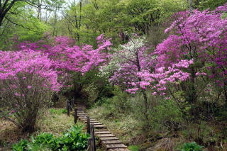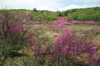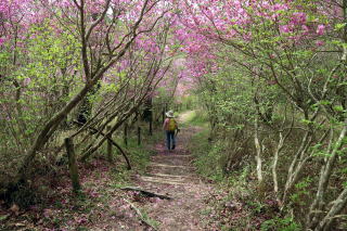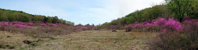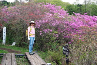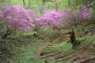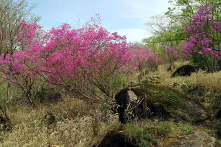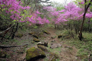 ① 井戸湿原から横根山・勝雲山 編 2025年05月18日のお山めぐりは横根高原のミツバツツジ探索です。 今日は日曜日、通常ならお山はお休みのS&Pですが、雨続きの間の晴れ間狙いでサクッと動いてみることにしました。9時過ぎの上部の駐車場は満杯、下の駐車場の空いてる中間部から9時16分に出発です。高曇りの前日光牧場の牛の放牧は6月からか、牛の姿はありません。 下の駐車場から出発 砂利道へ ![]() 砂利道の左上部、右下のシロヤシオは開花、ズミはもうすぐのようです。早くも帰りの男性とスライドします。横根山取り付きの分岐で少考、まずは象の鼻展望台ですが、左の山側はミツバツツジの満開が続き、ときおり蕾のシロヤシオ、開花しているシロヤシオが現れ、象の鼻手前左のシロヤシオは満開で、いい時に当たったようです。 象の鼻でミツバツツジを入れて証拠データを撮り、展望台からパノラマの動画データをデジカメに落とします。 砂利道沿いのツツジ 象の鼻にて ![]() 象の鼻展望台から赤城連山・袈裟丸連峰、皇海山、日光白根山、日光連山 ![]() 象の鼻から井戸湿原です。周りはミツバツツジ、咲き始めたシロヤシオ、仏岩の分岐(以下「仏岩分岐」とします。)で右下に向かいます。この時期の周回は20年ぶりですがミツバツツジの中という記憶はありません。スライドするハイカーも多くなり数えるのはやめました。 仏岩にもミツバツツジ ミツバツツジの登山道が続く ![]() 井戸湿原の西端部から右に周回、ミツバツツジのトンネルを抜けると左に展望、咲き始めたヤマツツジもあります。お空もほころんで青空も出てきました。木道の左右の満開のミツバツツジは壮観でスライドハイカーも増えました。湿原中央部の木道で憩う数人を見て、五段の滝を覗いてみることにしました。 ミツバツツジのトンネル ミツバツツジ満開の登山道 ![]() すぐに木道の両脇に紅白というか、ミツバツツジとシロヤシオの競演です。五段の滝から湿原荘へ戻る途中も同様でした。分岐から右上へミツバツツジの中を登り、湿原荘前のテーブルベンチは満杯、奥の東屋でランチ休憩です。TV番組ならドローン動画で大展望でしょうがこちらは角度がでませんので撤収です。 ミツバツツジとシロヤシオ 南岸から湿原荘方面 ![]() 湿原中央の木道から東 ![]() しばらく行っていない井戸湿原北岸4分の1を歩いて往路の分岐から再び仏岩分岐に戻ります。ちょうど湿原を一周したことのなります。前半よりも少なめですが両側ミツバツツジ、ときどきシロヤシオでした。途中に右に登る薄い踏み跡は次回以降に繰り延べしましょう。 仏岩分岐に戻る途中でバス乗降者かかなりの数とスライドします。今度は仏岩分岐から右に向かいます。既知の道ですがこちらもミツバツツジ、シロヤシオが両側・頭上に出てきます。 湿原中央部の木道にて 仏岩から横根山への途中も ![]() 十字路を直進で少々登りから次の丁字路は左で横根山です。直下でこちらも十数人とスライド、今日は人もいっぱいでした。 横根山直下からの展望 牧場上部の遊歩道から勝雲山 ![]() 13時13分着の駐車場はS&P車の下もマイクロバス2台を含んでほぼ満杯になっていました。 所要時間は3時間57分、歩行時間はあてにならず省略、展望・ツツジ探索でした。 帰路、勝雲山に寄ってみました。取り付き口にバイク1台と満開のミツバツツジ、山頂には無線交信中の男性がいました。振り返ればミツバツツジが頭上にあったようです。伐採地の中の三角点にタッチ、奥でパノラマをデジカメに収めます。帰路は作業路を下ります。 登り口のバイクとミツバツツジ 山頂下から横根山 ![]() 所要時間は17分、こちらも展望+ちょっぴりミツバツツジのピークハントでした。 伐採地は腰高のカラマツの幼木で3~4年後はこの展望もなくなるでしょう。 GPS軌跡図(カシミール3D使用) ![]() |