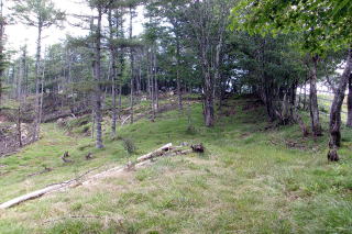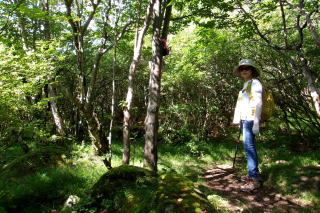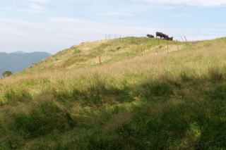 | ④ 方塞山から横根山 編 2025年08月05日のお山めぐりは方塞山から横根山です。 今日の予報は山手はすべて午後は雷雨模様で遠出はパス、近間の困ったときのお山をお散歩です。前回同様、駐車場スペースから8時32分にスタート、まずは方塞山です。足元は前回に比べ乾いていました。尾根が直角に左に曲がる地点前で左のカラマツ林の中の作業道を辿ってみることにしました。 さすが牧場、アブがまとわりつきます。道は途中から左へ下りになり、ここから右上へ直登で牧柵沿いの登山道に出て左へ、すぐに方塞山でした。名板をデジカメに収めて右の横根山方面へ下ります。ベンチが2基の展望所からは遠くは×で富士山は見えません。2箇所目のベンチの展望所も同様で右に赤城山が薄く浮かんでいました。 ここで左の作業道へ 方塞山へ ![]() 右に牛さん4頭のいるピークを見ながら下りきった鞍部は丁字路分岐、右の舗装路から前日光牧場への舗装路を見送って直進です。トンボが多くなってアブ、コバエも少なくなってきました。樹林帯に入って見慣れた木橋、ピークの左を巻く登山道から横根山取り付きの林道へ出て横断して登山道を登り、今年3度目の横根山でした。 ピークに牛さん4頭 背後に方塞山 ![]() 横根山から井戸湿原へ最短ルートで下ります。湿原荘跡のあずま屋はスズメバチの巣が撤去されていました。ザックを下ろして小休憩です。下界は軽く30度は越えているでしょうが、ここは別天地、涼しい風が通り抜けます。 リスタートですが五段の滝はパス、木道近くのウスユキソウ、リンドウを見て象の鼻へ向かいます。あの白いお花は見えませんでした。登りは若干汗をかきます。ほとけ岩前を通過し左折します。右下に下って行く4人組のハイカーの姿が見えます。展望台の男女2名に挨拶して撤収です。 牧場内には牛さんの隣のエリアで鹿さん1頭がお食事中でした。前日光牧場前の駐車場を通過し、舗装路を下ります。右から左に回り込んで往路の分岐の手前を通過、進行方向右ののピークには往路で見た牛さんのほかに2頭の鹿がこちらの様子をうかがっているようでした。カメラを構えて1画像をデジカメに収めていると右に消えました。 湿原中央のリンドウ 往路のピーク上の牛と鹿 ![]() 舗装路が樹林帯に入る手前の広くなっている路肩の木陰でザックを下ろし、折り畳み椅子を出してランチ休憩です。11時を過ぎて風も少し強くなって、雲が出てきたようです。リスタートで駐車場所には12時33分の到着でした。 駐車場所(0:01)方塞山取り付き()0:27方塞山(1:02)横根山(0:22)井戸湿原(0:27)象の鼻(0:42)ランチ場所(0:18)駐車場所 所要時間は4時間01分(歩行3時間19分)、展望の周遊ピークハントでした。 |