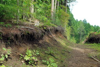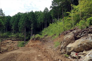 | 2025年07月27日のお山めぐりは福島県塙町の地形図無名峰「殿倉山」です。 2か所のシキンカラマツは少し早かったようで木陰のある路肩でランチ休憩した後、伐採の入った林道を歩いてみることにしました。もちろん湿地のシキンカラマツ探索と以前登ろうとしたお山の探索です。(藪が薄ければ登ってみましょうということです。) 今日は日曜日で伐採作業は休み、林道入口に駐車し12時17分に出発、路肩のヤマユリ、ウバユリを眺めて奥に進みます。林道は拡幅したばかりで右側の伐採地を見ながら南進、左にそして右に方向を変えて下りになり、鞍部付近から伐採が終了します。道路の拡幅で左斜面も伐採が入り、明るくなっていました。 林道へ 伐採地を過ぎて ![]() 道なりに進んで地形図実線路の終点へ着きますが、道路沿いには盛期のフシグロセンノウとウバユリが咲いていました。終点は沢沿いにあったと記憶していますが、埋め立てられて高い位置を対岸へ道路が渡っていました。 地形図実線路終点 旧道が右上に分かれる ![]() 登りの林道はほぼ直線で殿倉山の南面を巻いています。右に旧道らしき道型が現れ、拡幅林道の上部にあります。傾斜が緩んで林道が下り加減になったところで右背後に旧道が合流します。 林道は先へ下り気味に 旧道を戻って左上へ ![]() 山頂は右上ですが藪が濃い。旧道に入って少し登り返した地点で藪が薄くなった所から山中に入って行きます。薄い雑木薮、そして笹薮の登場です。薄めの部分を選んで登り、笹薮帯を抜けるとほとんど下草のない松混じりの混交林でした。尾根は左に方向を変えてすぐに一番の高みに到着でした。 左上へ 笹薮 山頂にて ![]() 山頂は展望なしでそそくさと撤収、往路を忠実に戻ります。さいわい昆虫どもとの遭遇もなく、腰の忌避剤も使わずに済み、無事に旧道に飛び出しました。旧道を左に下り、すぐに往路と合流です。おあとは往路を忠実に戻るだけでした。 駐車場所(0:25)実線路終点(0:10)取り付き(0:11)山頂(0:05)取り付き(0:06)実線路終点(0:25)駐車場所 所要時間は1時間25分(歩行1時間22分)、真夏の道のないお山のピークハントでした。 参考 国土地理院電子地形図「磐城片貝」 「ふるさと福島県 山名辞典」さんから山名情報収集 夏場の薮は本来歩かないのですが、今日は山頂直下まで伸びた林道と気温と涼しい風に助けられました。 |