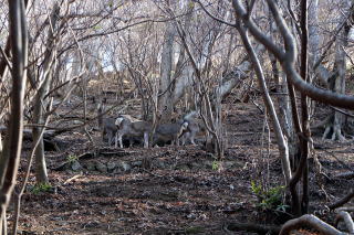 | 2026年02月04日のお山めぐりは神奈川県山北町の大野山です。 山北町観光駐車場から7時59分の出発、西進して山北駅前を通過します。樋口橋交差点で国道246号線に合流、すぐ右に分岐し並走する県道76号線に復帰し安戸隧道(トンネル)を抜けて丁字路交差点には大野山入口のバス停・案内板があり、右上に舗装路を登って行きます。 朝の駐車場はしぼれ車のみ 十字路は直進 ![]() 東名高速下を通過し、最初の十字路は左に帰路予定のつぶらの公園方面を見て、直進します。左にカーブしてすぐに二股の分岐、右上に案内板が誘います。舗装路は植林帯の急登で最後にジグザグ登りから左上に進んで古宿集落の入口で、今日のお目当てその1「丹沢キャサリン・丹沢クリステル姉妹」でした。 ここで右上へ 丹沢キャサリン・クリステル ![]() 右上に茶畑を見て左に案内板が誘います。右側に閉校した共和小学校、その先の正面に富士山が見える丁字路は右折します。少し進んで左にこのルート最後の富士山を見て道なりに進み、二股の分岐は直進で、左にカーブする地点で大野山ハイキングコースの案内板を見て右上の登山道に入ります。 丁字路の富士山 大野山ハイキングコース入口 ![]() お堂前を通過し、登山道らしくなってきた道型は植林内の登りから延々左斜面のトラバースになり、3箇所ほどハイシニアのS&Pは斜度の付いた細道と左下の急斜面にぴーくぴくでした。 トラバース道が終了し、植林帯の尾根に登る地点で女性ハイカーとスライド、本日の地蔵岩ルートで最初で最後のハイカーでした。伏木の階段道の登りで体力を削られました。右が開けて663mピークが目に入りました。登るにつれて視界が広がり、背後に海も目に入りました。 右上に鹿5頭のうち2頭 視界が開けて右に663mピーク ![]() 登り切って左へ進み、舗装路に合流しました。北側には檜洞丸ほかの丹沢方面のパノラマが広がっており、さっそくデジカメに収めます。右は高杉へのルート、左の山頂までは15分の案内板で左に向かいます。鞍部からの登り返しの舗装路で、左に箱根連山、背後に663mピーク方面が開けていました。 丹沢方面 箱根方面 ![]() 11時25分着の山頂には石祠一基、奥に富士山が見えます。山頂近くのベンチはほぼ満席、北端でランチ休憩です。富士山を眺めながらのんびりしました。 山頂へ 富士をバックに ![]() 予定通り帰路は大野山の全景を撮りにさくら山経由で、南西に富士山を見ながら進みます。左に曲がってもう展望は終わりと思っていたら、右に方向を変えて再び富士山がドーン、そのあとも箱根山塊から愛鷹山塊、そして富士山とジグザグ下りで景色が現れました。 下りの途中で富士山 左は愛鷹連峰か ![]() さすがに水平の実線路近くになると樹林帯に入ります。無人販売所の小屋前を通過し、実線路を横断し、右の送電線鉄塔から右の富士山で展望は一時終了です。 さくら山に登り返して富士山から大野山の大展望です。しばし足を止めて動画と静止画をデジカメに収めます。すぐ下の駐車場からの観光客の多数の男女がくつろいでいました。つつじ山は本日はパス、往路に戻ってつぶらの公園入口で左の山北駅方面に向かいます。 無人販売の東屋 さくら山から富士山 ![]() 道は一時登りになって左の地蔵堂を通過すると下り一辺倒になります。東名高速下の十字路で往路に合流、右へ下ります。おあとは往路を忠実に戻ることにしました。駐車場には14時42分の到着でした。 観光駐車場(0:31)大野山入口バス停(0:46)丹沢キャサリン・クリステル姉妹(0:14)地蔵岩ルート登り口(1:32)高杉へのルート分岐(0:17)大野山(0:40)無人販売の小屋(0:36)さくら山(0:53)大野山入口バス停(0:22)観光駐車場 所要時間は6時間43分(歩行5時間50分)、富士山展望の山旅でした。 |